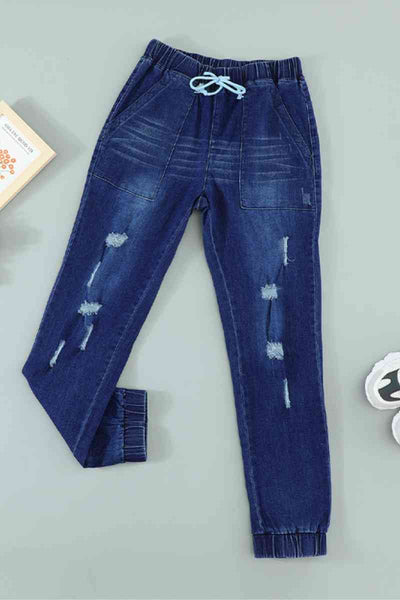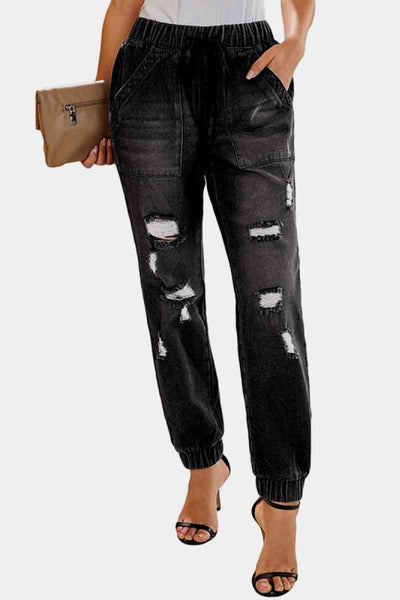 - Feature: High waist, drawstrings, side pockets, distressed, full length, elasticated bottom