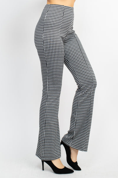 A knit pair of bell-bottom pants in a houndstooth pattern featuring a high waist, princess seams, fit and flare, and a full length.