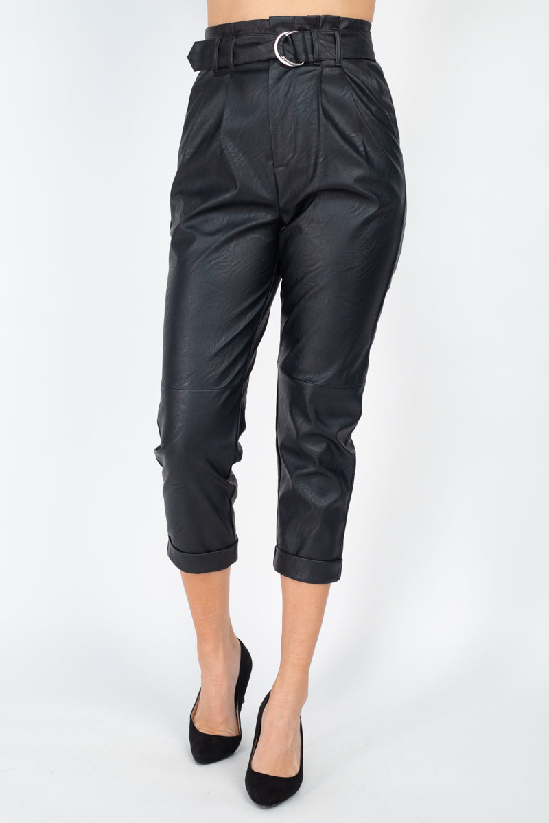 A knit pair of pants featuring a solid color, an O-ring belt, pockets, pleats, high rise, and a skinny fit in a Capri length.