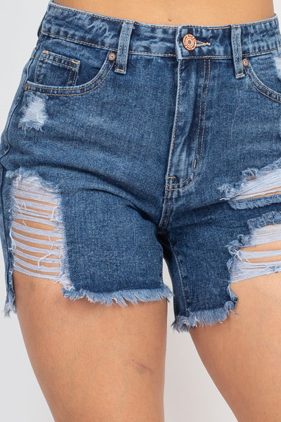 A pair of ripped mini denim shorts featuring heavy distressing, traditional five-pocket construction, frayed hem, midrise, belt loops, and a zip fly with button closure.