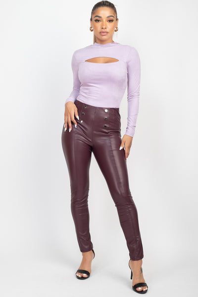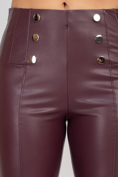 A pair of faux leather skinny leg casual pants featuring solid color, button-detailed front, a high-rise waist, and a full length.