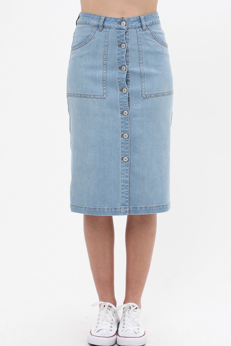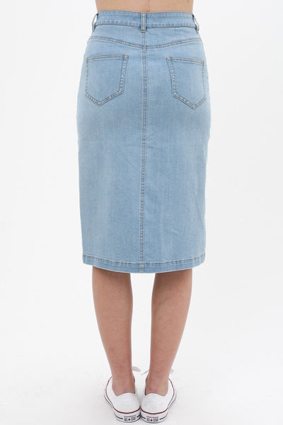 DENIM MID THIGH LENGTH SKIRT WITH BUTTON DOWN FRONT DETAIL..