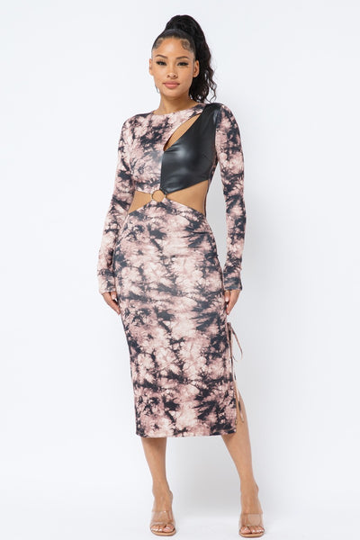 TIE DYE LONG SLEEVE MIDI DRESS WITH CUT OUT DETAILS AND PU LEATHER DETAILS