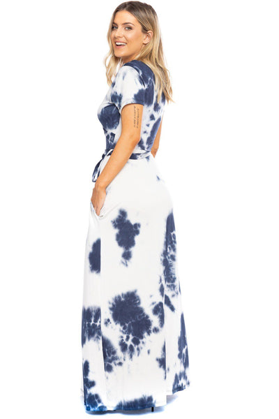 Made In U.S.A S.M.L Breathable summertime maxi dress, featuring layered bust and waist tie. Made of a poly-spandex blend fabric 95% Polyester 5% Spandex Navy Tie Dye HHF Breathable Summertime Maxi Dress