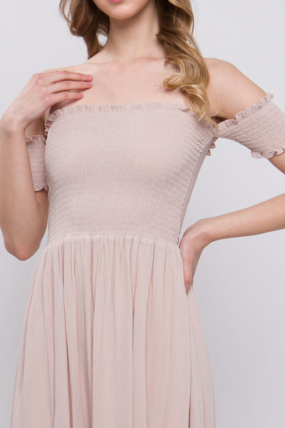 Lightweight woven rayon shapes a smocked bodice with short, off-the-shoulder sleeves. Flowy midi skirt has twin side slits.