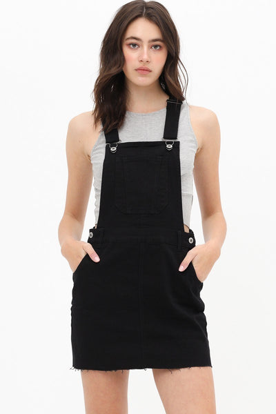 Imported  S.M.L Square neck, Adjustable shoulder straps, Raw edge hem, 2 Side and 2 back pockets, Belt loops, Side button up closure, Relaxed fit silhouette. 97% Cotton 3% Spandex  Black  LOV Square Neck Adjustable Shoulder Straps Dress