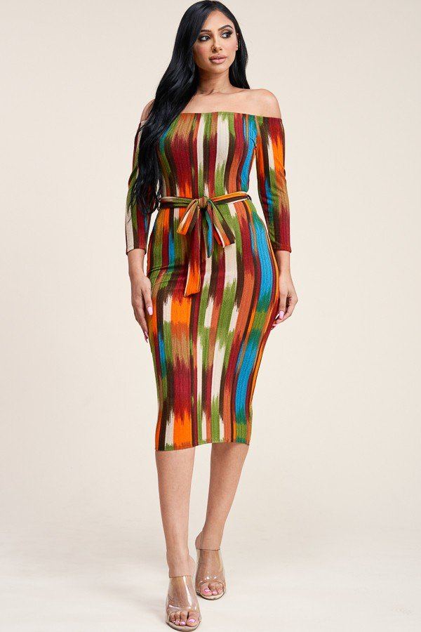 Multi color Antenna print 3/4 sleeve off the shoulder midi dres with waist tie