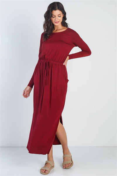 solid color, round neckline, back button loop closure, midi sleeves, relaxed fit, elastic waistband with adjustable drawstring, maxi length, two side pockets, unlined, non-sheer, stretchy, stylish, trendy, lifestyle, comfy, everyday look