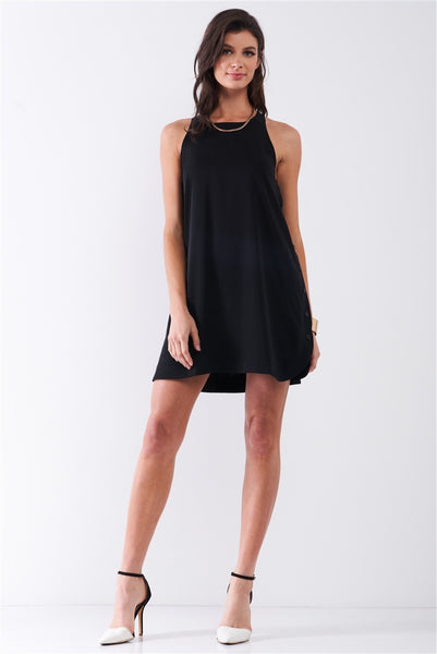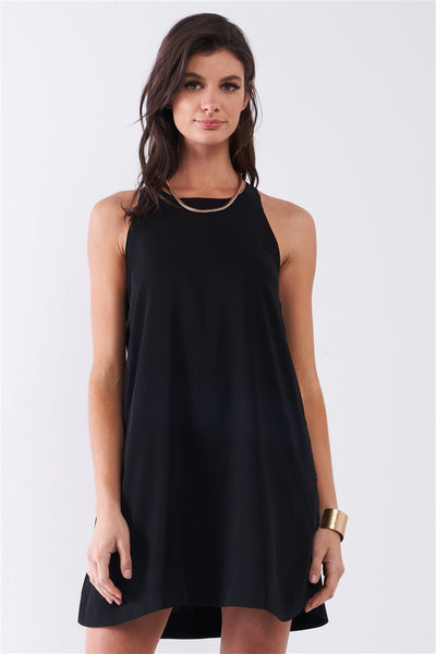 Black Sleeveless Crew Neck Side Snap Button Down Racerback Mini Tent Dress