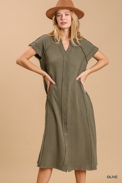 Split Neck Button Down Midi Dress with No Lining
