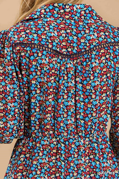 Collared Neckline Button Down Floral Print Dress with Crochet Trimmed Details