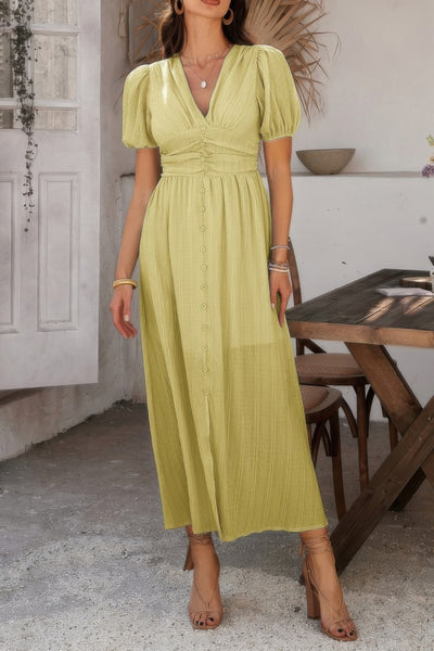 Radiate elegance in this Solid V-Neck Puff Sleeves Knot Detail Dress, crafted for both comfort and style. Featuring a flattering V-neckline, chic puff sleeves, and a stylish knot detail at the waist, this dress is perfect for casual outings, vacations, or relaxed events.