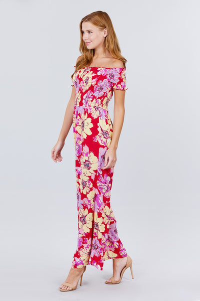 SHORT SLEEVE OFF THE SHOULDER SMOCKED DETAIL WITH FLORAL PRINT LONG WIDE LEG JUMPSUIT.
