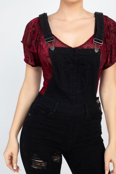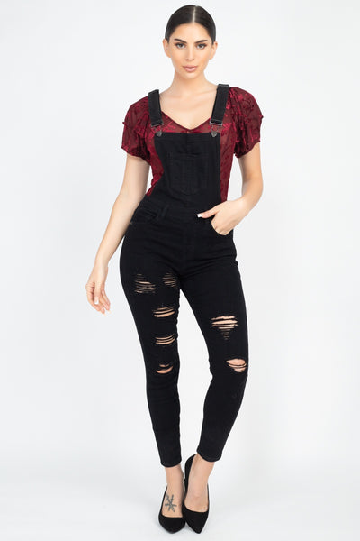 A pair of denim overalls featuring adjustable shoulder straps, a front bib pocket, front distressing, five-pocket construction, Y-back, and a skinny leg.