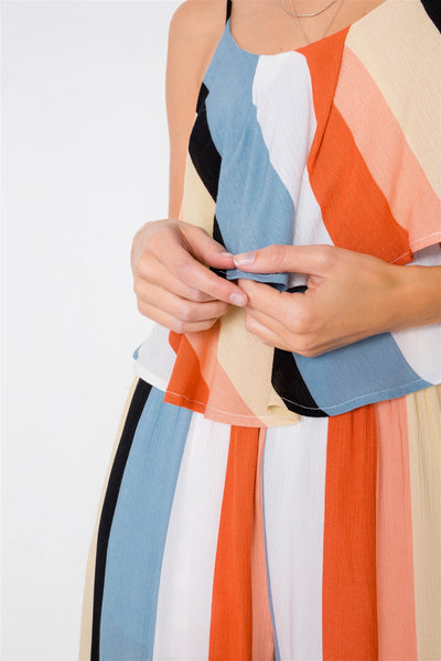 adjustable cami straps, flounce layer bodice, elastic waist band, blue black white orange and peach vertical striped color block, mini ankle slit, partially lined, stretchy.