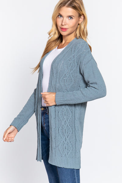Imported S.M.L LONG SLEEVE OPEN FRONT CHENILLE SWEATER CARDIGAN 100% Polyester  Steel Blue  ACT Chenille Sweater Cardigan Item Measurements: SIZE S Measurements: SIZE S Length:32" Waist:40" Bust:40"