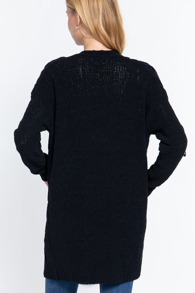 Imported S.M.L LONG SLEEVE OPEN FRONT CHENILLE SWEATER CARDIGAN 100% Polyester  Black ACT Chenille Sweater Cardigan Item Measurements: SIZE S Measurements: SIZE SLength:32" Waist:40" Bust:40"
