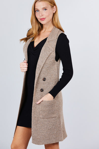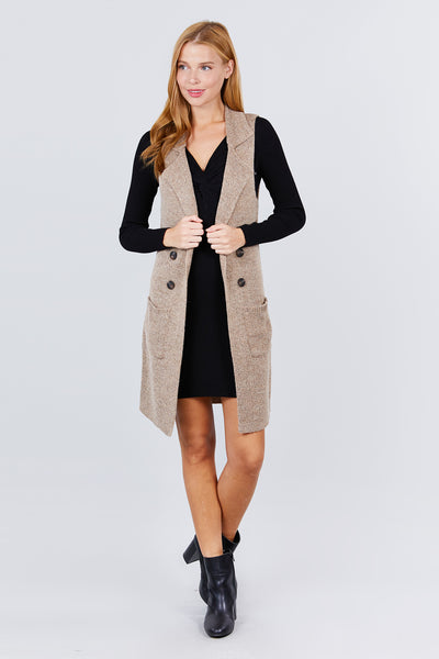 SLEEVELESS NOTCHED COLLAR WITH SIDE POCKET LONG SWEATER VEST