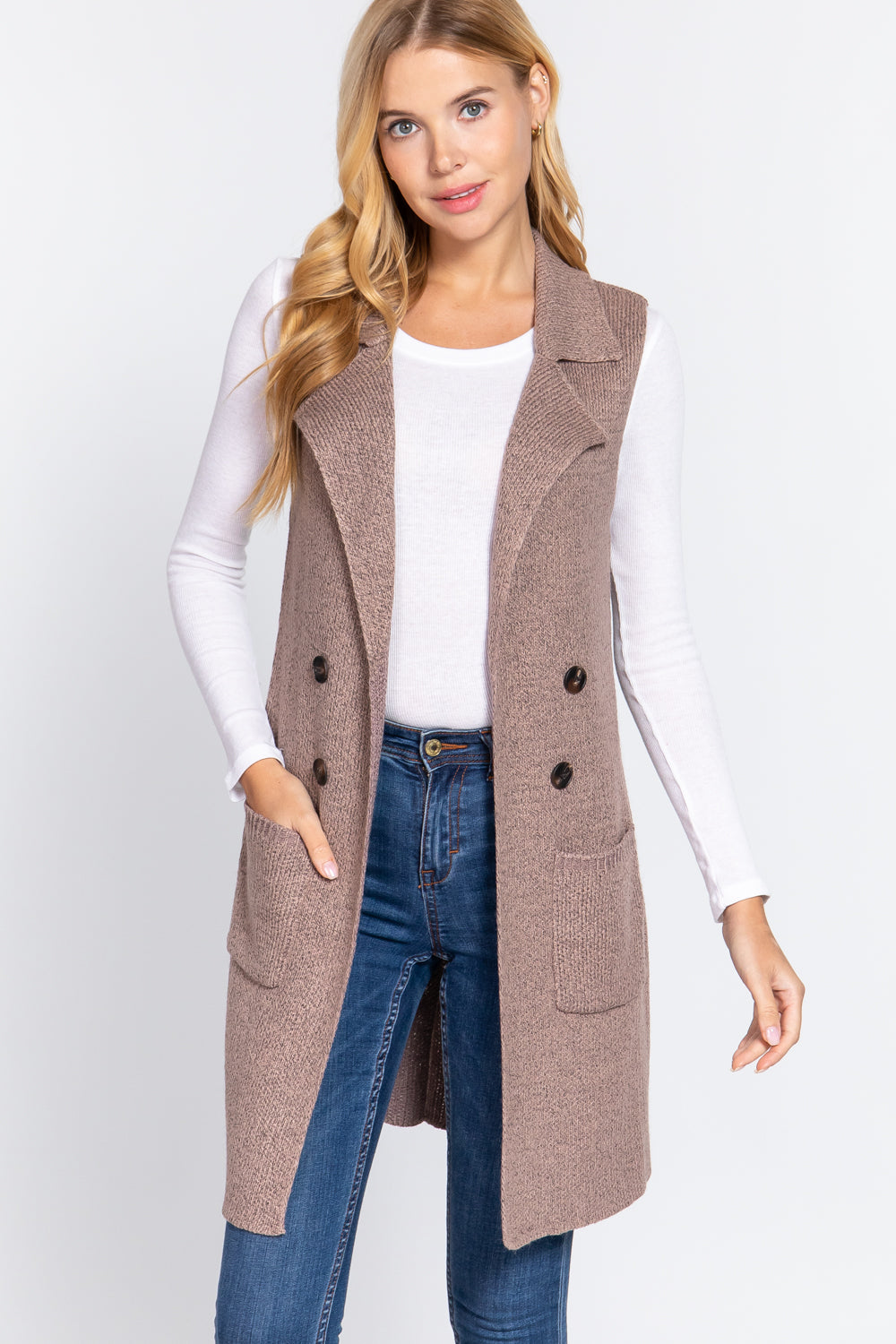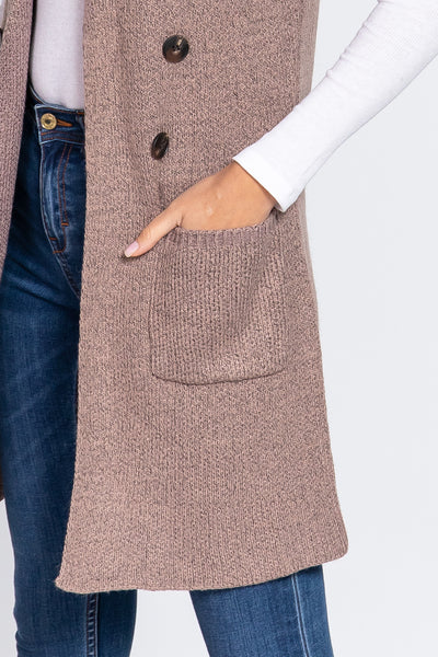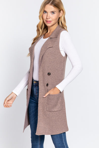 SLEEVELESS NOTCHED COLLAR WITH SIDE POCKET LONG SWEATER VEST