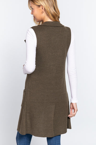 SLEEVELESS NOTCHED COLLAR WITH SIDE POCKET LONG SWEATER VEST