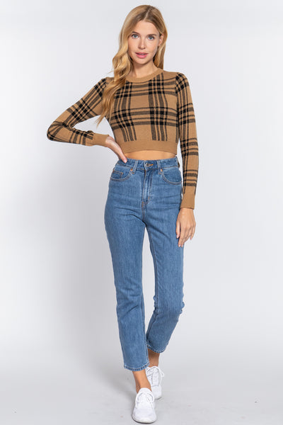 LONG SLEEVE ROUND NECK TARTAN CHECK CROP SWEATER
