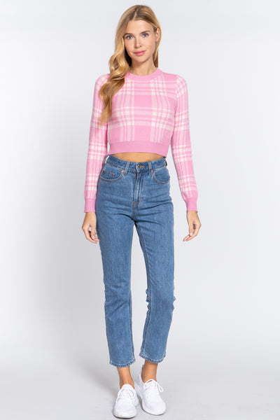 LONG SLEEVE ROUND NECK TARTAN CHECK CROP SWEATER