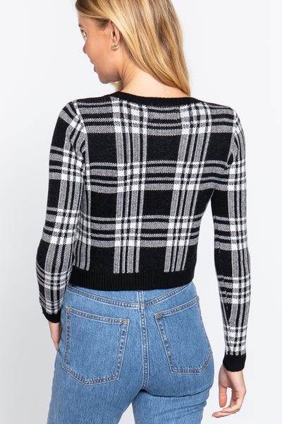 LONG SLEEVE V-NECK FITTED BUTTON DOWN PLAID SWEATER CARDIGAN