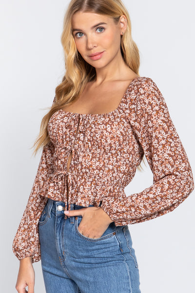 LONG SLEEVE SWEETHEART NECK FRONT SHIRRING AND RIBBON TIE DETAIL FLORAL PRINT WOVEN TOP