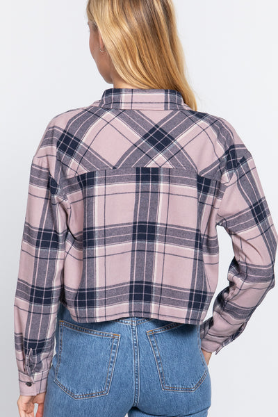 LONG SLEEVE NOTCHED COLLAR POCKET DETAIL PLAID JACQUARD CROP WOVEN SHIRT