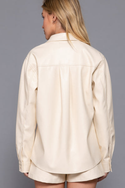 Elevate your wardrobe with our Long Sleeve Faux Leather Shacket in Ivory. Combining modern sophistication with edgy design, this shacket is crafted to make a stylish statement while keeping you comfortable and chic.
