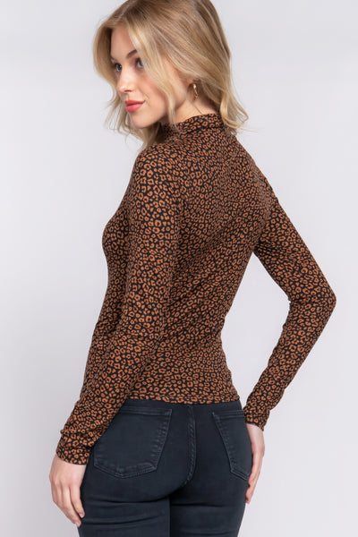 This top combines a sophisticated high neck design with a trendy animal print, making it a versatile piece suitable for various occasions.