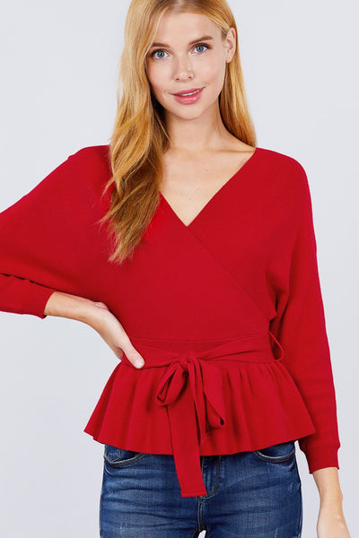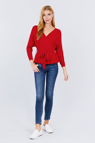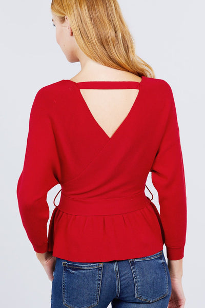 LONG SLEEVE V-NECK WRAPPED WAIST BAND SWEATER