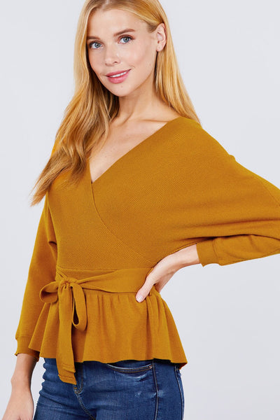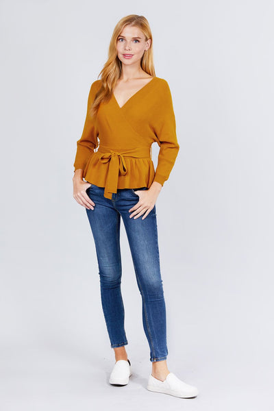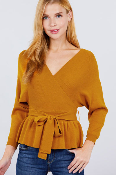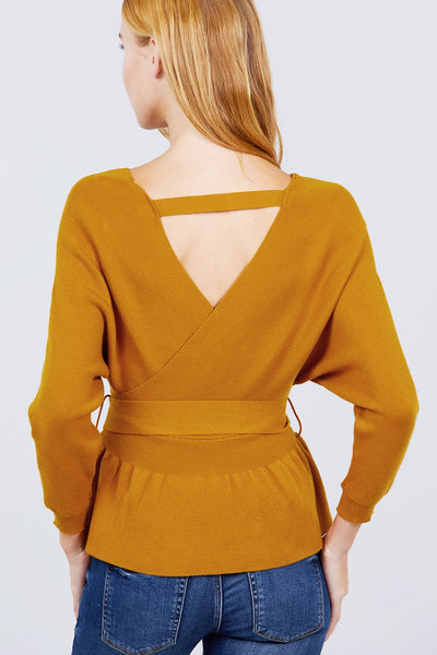 LONG SLEEVE V-NECK WRAPPED WAIST BAND SWEATER