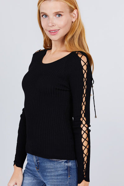 Long Sleeve W/strappy Detail Round Neck Rib Sweater Top