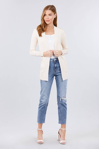 LONG SLEEVE RIB BANDED OPEN SWEATER CARDIGAN W/POCKETS