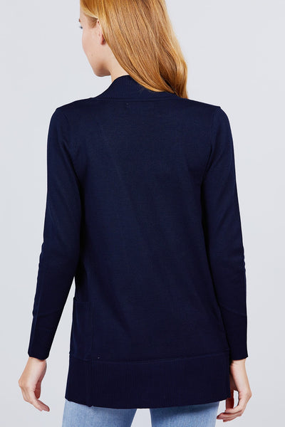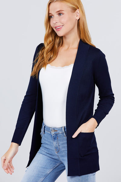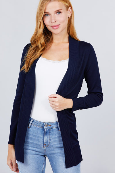 Imported S.M.L LONG SLEEVE RIB BANDED OPEN SWEATER CARDIGAN W/POCKETS 65% Polyester 33% Rayon 2% Spandex Dark Navy  ACT Long Sleeve Rib Banded Open Sweater Cardigan W/pockets