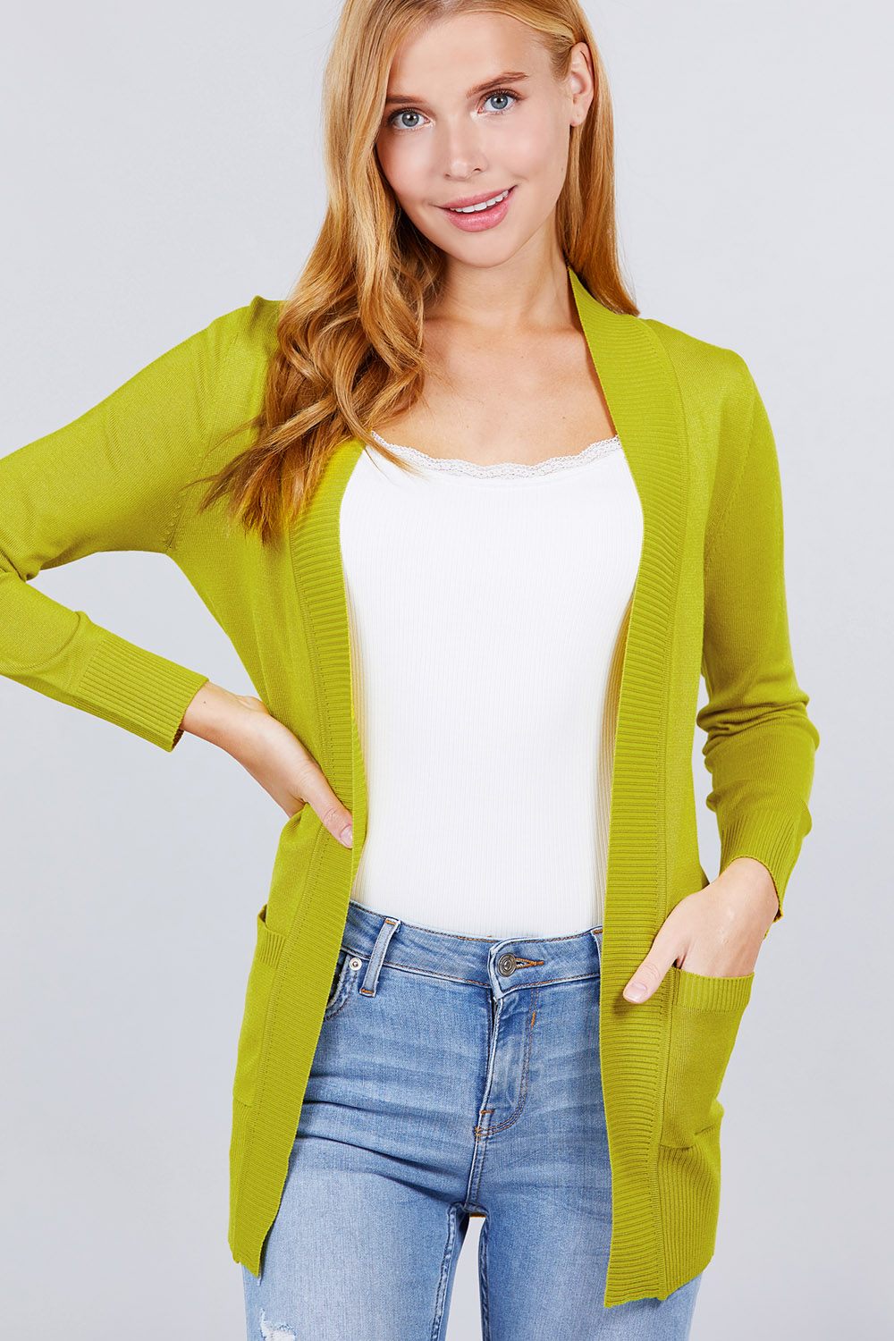Long Sleeve Rib Banded Open Sweater Cardigan W/pockets