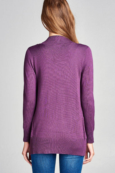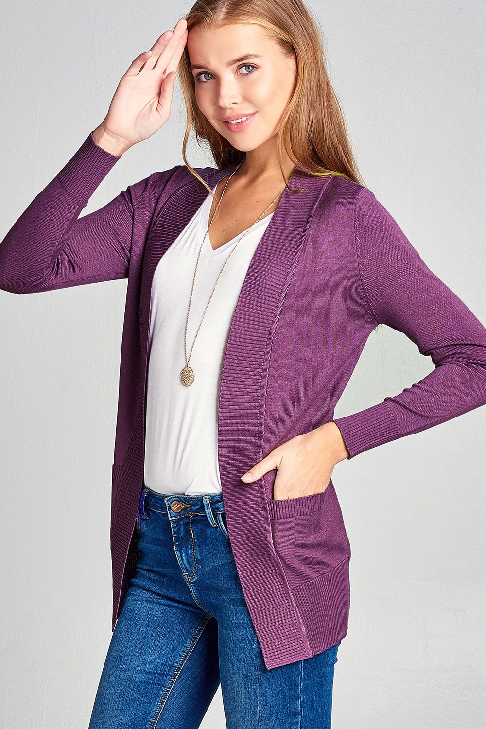 Imported S.M.L LONG SLEEVE RIB BANDED OPEN SWEATER CARDIGAN W/POCKETS 65% Polyester 33% Rayon 2% Spandex Purple ACT Long Sleeve Rib Banded Open Sweater Cardigan W/pockets