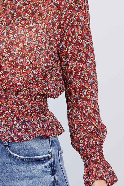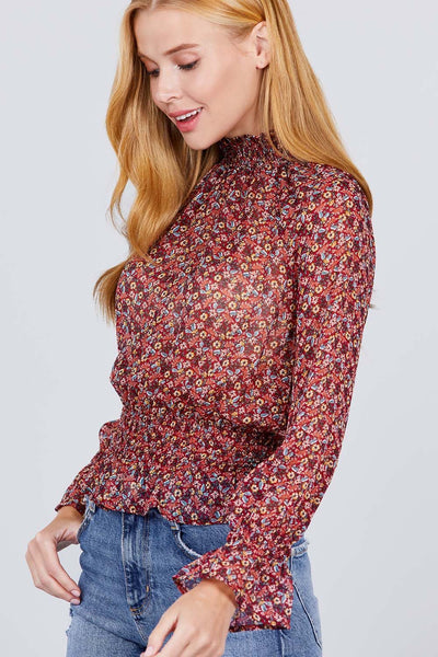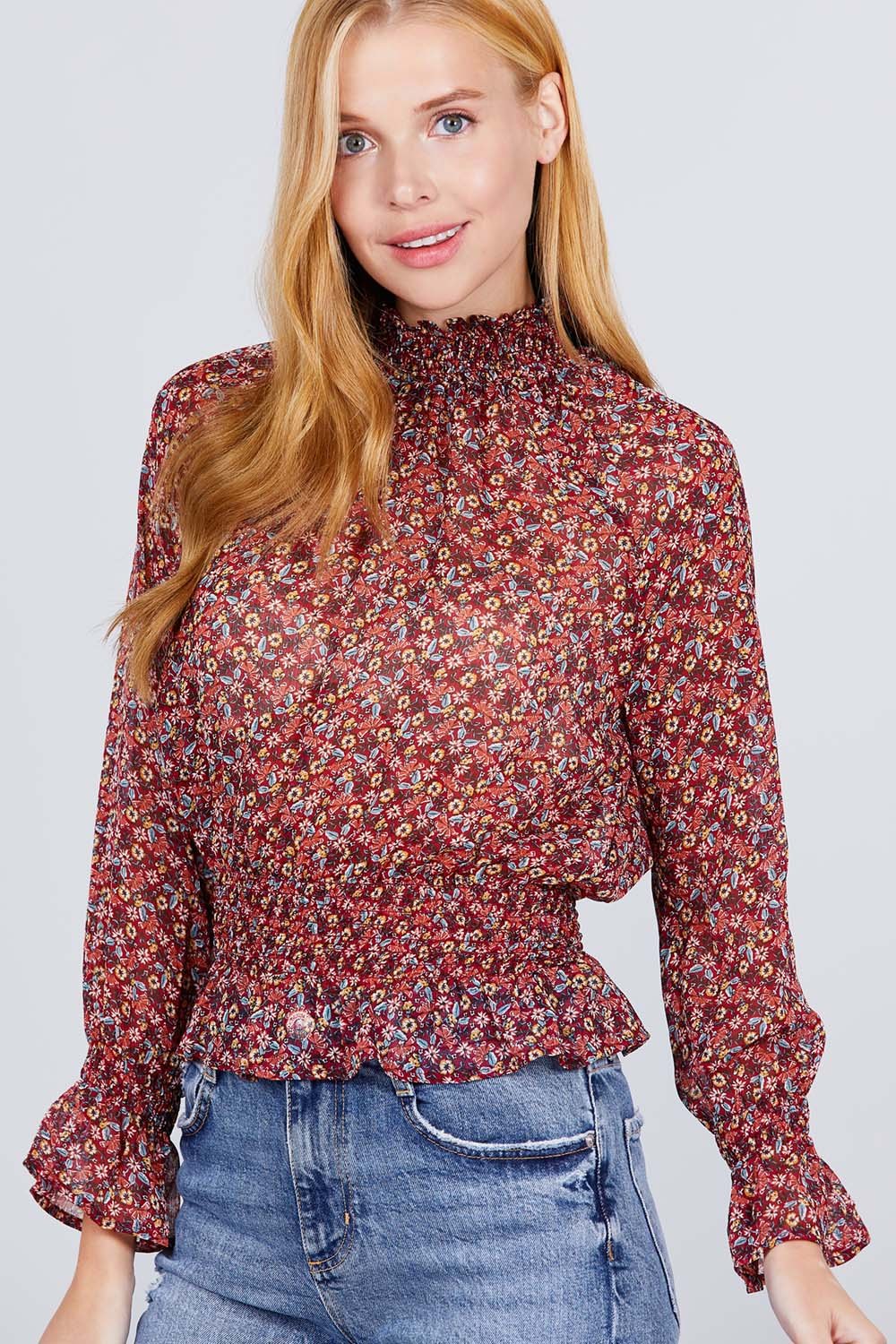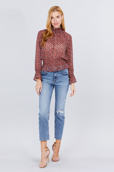 LONG RUFFLED RAGLAN SLEEVE MOCK NECK SMOCKED DETAIL PRINT WOVEN TOP