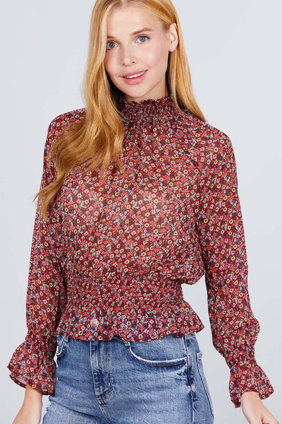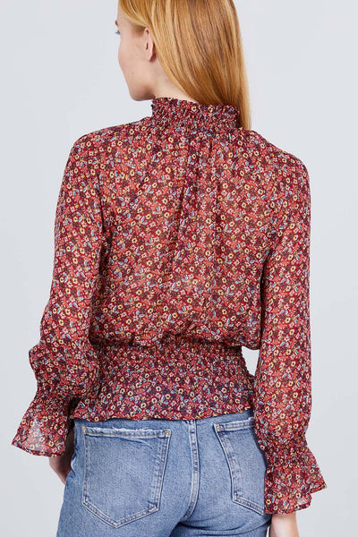 Long Ruffled Raglan Sleeve Mock Neck Smocked Detail Print Woven Top