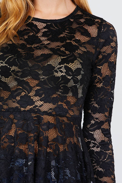 Imported S.M.L. LONG SLEEVE ROUND NECK PEPLUM LACE TOP 92% Nylon 8% Spandex Black ACT