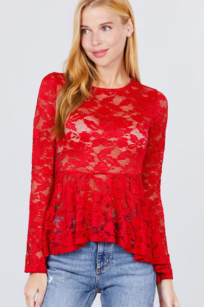 Imported S.M.L. LONG SLEEVE ROUND NECK PEPLUM LACE TOP 92% Nylon 8% Spandex Red ACT