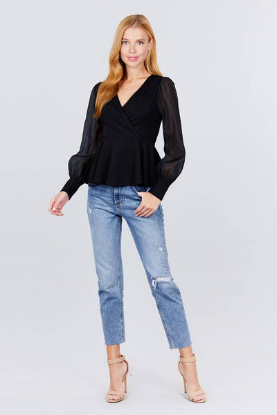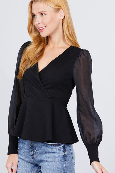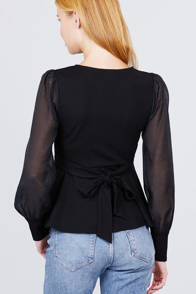 LONG ORGANZA PUFF SLEEVE V-NECK SURPLICE WITH SELF TIE KNIT PEPLUM TOP