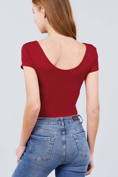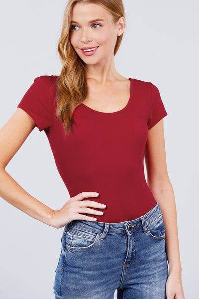 Imported S.M.L SOLID SHORT SLEEVE SCOOP NECK BODYSUIT 95% Cotton 5% Spandex  Ruby Burgundy ACT Solid Short Sleeve Scoop Neck Bodysuit