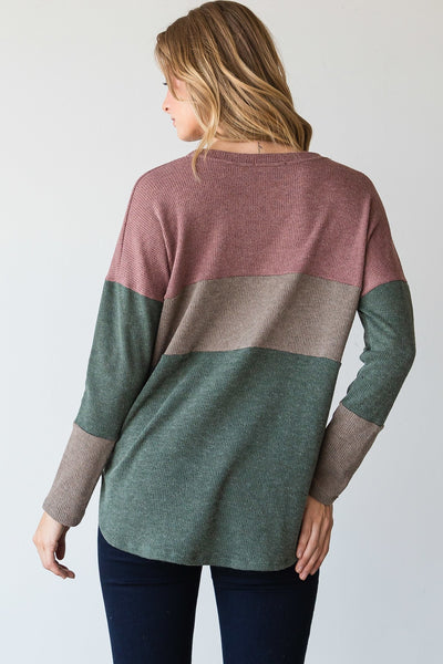 Winter is coming! This basic colorblock top will not only keep you or your customers warm, but it'll make them feel stylish wearing it! Featuring classic earth tones, it stays trendy while also being functional! It's waffle fabric gives it stretch and will allow anyone to pull on this top! Perfect for a day in full of snuggles and warm goodness or for going out to casually meet up with friends!