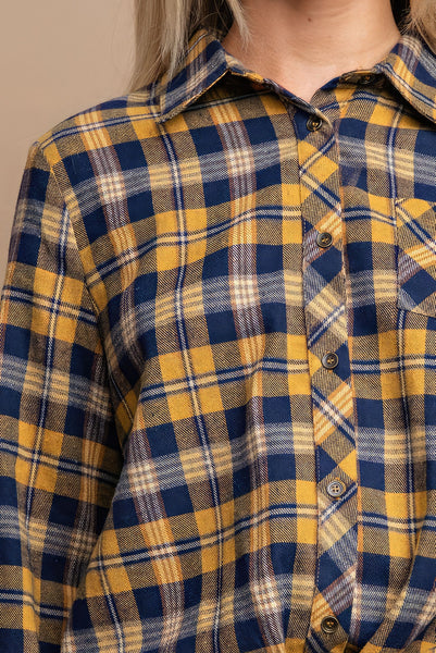 Get ready to elevate your casual style with our Tie Front Button Down Plaid Shirt in Mustard. Add it to your cart now and experience the perfect blend of comfort and fashion!