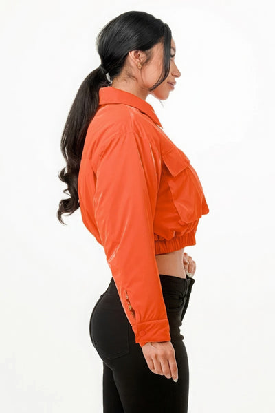 Make a bold statement with our Shiny Puffer Cropped Bomber Jacket in Orange. Add it to your wardrobe today and embrace effortless style and warmth!
