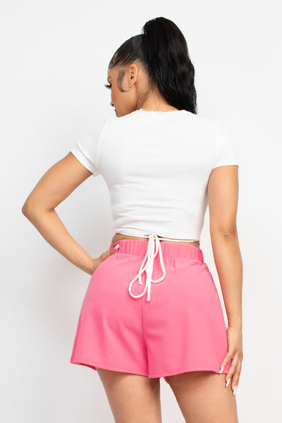 A ribbed-knit crop top in solid color featuring short sleeves, a wrap design with self-tie drawstring, and a surplice neckline with lace trim.