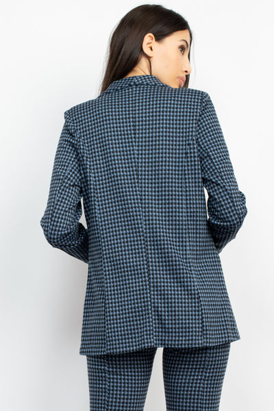 A plaid knit open-front blazer featuring a houndstooth pattern, long sleeve, a notch lapel, seamed, and a hip-length.