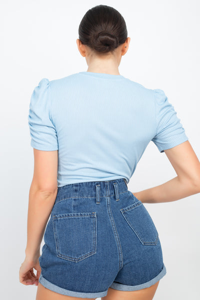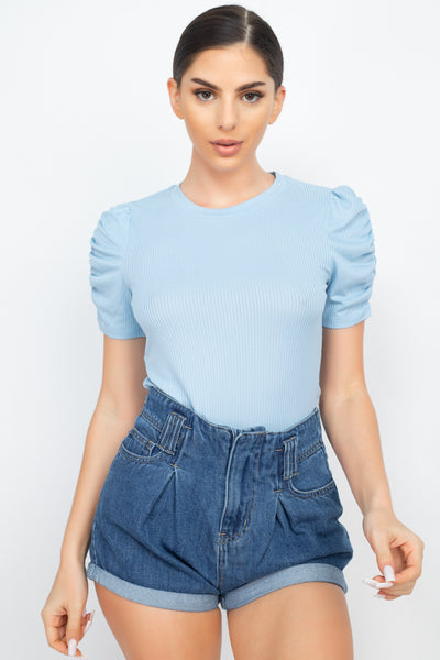 A ribbed knit fashion top in a solid color featuring a round neckline, short ruching sleeves, and a fitted silhouette.
